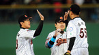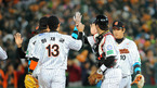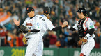 [OSEN=부산,손용호 기자]롯데가 지긋지긋한 포스트 시즌 연패의 늪에서 벗어나며 부산 팬들에게 기쁨을 선사햇다. 황재균이 포스트시즌 첫 세이브를 거둔 김사율과 하이파이브를 나누고 있다. 17일 오후 부산 사직구장에서 벌어