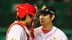 [OSEN=인천, 민경훈 기자]2011 롯데카드 프로야구 플레이오프 SK 와이번스와 롯데 자이언츠의 경기에서 1회초 SK 송은범이 롯데 홍성흔에 볼넷을 허용하고 2사 만루가 되자 정상호 포수와 얘기를 나누고 있다. 19일 문학구장에서 벌
