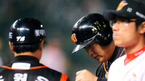 [OSEN=인천, 민경훈 기자]2011 롯데카드 프로야구 플레이오프 SK 와이번스와 롯데 자이언츠의 경기에서 1회초 2사 주자 만루 롯데 강민호 타석에서 2루 주자 이대호가 SK 덕아웃쪽을 바라보며 인사를 하고 있다. 19일 문학구장에서