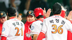 [OSEN=인천,지형준 기자] 이제 1승 남았다. SK 와이번스가 5년 연속 한국시리즈 진출을 눈앞에 뒀다. SK는 19일 문학구장에서 열린 롯데와의 플레이오프 3차전에서 우완 선발 송은범의 무실점 호투와 팀내 최고령 최동수의 결승타,