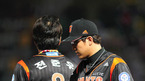 [OSEN=인천,손용호 기자]'2011 롯데카드 프로야구 플레이오프' 4차전 SK 와이번스와 롯데 자이언츠의 경기 3회초 2사 만루 김상진 코치가 마운드에 올라 윤희상 투수를 진정시키고 있다. 20일 인천 문학구장에서 SK 와이번스와 롯데