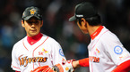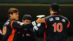 [OSEN=인천, 민경훈 기자] 20일 오후 문학구장에서 열린 '2011 롯데카드 프로야구 플레이오프' 4차전 SK 와이번스와 롯데 자이언츠의 경기에서 롯데가 3회말을 병살처리로 막아낸 후 덕아웃에서 홍성흔과 이대호가 하이파이브를 하