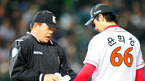 [OSEN=인천, 민경훈 기자] 20일 오후 문학구장에서 열린 '2011 롯데카드 프로야구 플레이오프' 4차전 SK 와이번스와 롯데 자이언츠의 경기에서 4회초 1사 주자 없는 롯데 홍성흔 타석에서 문승훈 구심이 SK 선발 윤희상에게 다가가 로