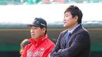 [OSEN=인천, 민경훈 기자] 20일 오후 문학구장에서 '2011 롯데카드 프로야구 플레이오프' 4차전 SK 와이번스와 롯데 자이언츠의 경기가 열릴 예정인 가운데 양팀이 훈련시간을 가졌다. SK 이만수 감독 대행과 양준혁 해설자가 그라