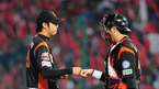 [OSEN=인천,손용호 기자]'2011 롯데카드 프로야구 플레이오프' 4차전 SK 와이번스와 롯데 자이언츠의 경기 선발 부첵에 이어 마운드에 오른 장원준이 4이닝 무실점의 호투를 하고 마운드를 내려가기 전 강민호 포수와 주먹을 마주