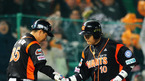 [OSEN=인천, 민경훈 기자] 20일 오후 문학구장에서 열린 '2011 롯데카드 프로야구 플레이오프' 4차전 SK 와이번스와 롯데 자이언츠의 경기에서 6회초 첫타석에서 교체 투입된 이영욱에게 롯데 이대호가 좌중월 솔로 홈런을 날린 후