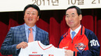 [OSEN=광주 ,백승철 인턴기자] 21일 오후 광주 KIA 제1공장 강당에서 열린 선동렬 신임감독 취임식에서 선동렬 감독과 이삼웅 사장이 기념촬영을 하고 있다. KIA는 지난 18일 조범현 감독 사퇴와 함께 선동렬 전 삼성 감독의 선임을