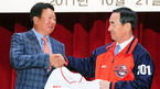 [OSEN=광주 ,백승철 인턴기자] 21일 오후 광주 KIA 제1공장 강당에서 열린 선동렬 신임감독 취임식에서 선동렬 감독과 이삼웅 사장이 악수를 나누고 있다. KIA는 지난 18일 조범현 감독 사퇴와 함께 선동렬 전 삼성 감독의 선임을 발