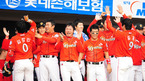 [OSEN=부산, 김영민 기자] 22일 우천으로 연기된 '2011 롯데카드 프로야구 플레이오프' 5차전 롯데 자이언츠와 SK 와이번스 경기가 23일 부산 사직야구장에서 열렸다. 6회초 무사 1루 박정권 투런홈런을 날리자 SK 선수들이 덕아웃에