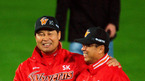 [OSEN=부산, 손용호 기자]전년도 챔프의 위력은 여전했다. 페넌트레이스 3위 SK 와이번스가 2위 롯데 자이언츠를 꺾고 5년 연속 한국시리즈 진출의 쾌거를 이뤘다. SK 이만수 감독이 정우람을 반갑게 맞이하고 있다. SK는 23일 사직
