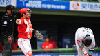 [OSEN=부산, 김영민 기자] 22일 우천으로 연기된 '2011 롯데카드 프로야구 플레이오프' 5차전 롯데 자이언츠와 SK 와이번스 경기가 23일 부산 사직야구장에서 열렸다. 1회말 SK 선발 김광현이 선두타자 김주찬을 진루시키며 아쉬워하