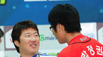 [OSEN=대구,손용호 기자]24일 대구 시민체육관에서 벌어진 '2011 롯데카드 프로야구' 한국시리즈 미디어데이에서 입담 대결을 벌인 삼성 최형우에게 SK 박정권이 다가서자 최형우가 뒤로 물러나고 있다. 최형우는 박정권에 대해 '