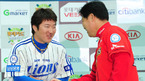 [OSEN=대구,손용호 기자]24일 대구 시민체육관에서 벌어진 '2011 롯데카드 프로야구' 한국시리즈 미디어데이에서 SK 이만수 감독과 삼성 최형우가 악수를 나누고 있다. 20세기의 첫 10년간 사자와 비룡은 한국 시리즈 우승을 3번씩