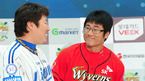 [OSEN=대구,손용호 기자]24일 대구 시민체육관에서 벌어진 '2011 롯데카드 프로야구' 한국시리즈 미디어데이에서 SK 이만수 감독과 삼성 최형우가 기싸움을 벌이고있다. 최형우는 박정권에 대해 '고등학교 시절 내 엉덩이는 정권