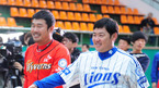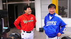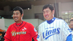 [OSEN=대구,손용호 기자]24일 대구 시민체육관에서 벌어진 '2011 롯데카드 프로야구' 한국시리즈 미디어데이에서 삼성 진갑용과 SK 이호준이 손을 잡고 입장하고 있다. 20세기의 첫 10년간 사자와 비룡은 한국 시리즈 우승을 3번씩