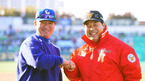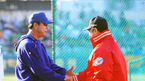 [OSEN=대구, 김영민 기자] 25일 '2011 롯데카드 프로야구 한국시리즈' 1차전 삼성 라이온즈와 SK 와이번스 경기가 대구 경기장에서 열렸다. 경기에 앞서 SK 이만수 감독대행과 삼성 김성래 코치가 인사를 나누고 있다. 양팀 1차전 선