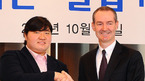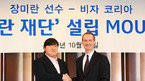 [OSEN=박준형 기자]27일 오전 서울 시청 프레스센터 기자회견장에서 진행된 '장미란 재단' 설립 양해각서(MOU) 체결식에서 역도선수 장미란이 비자코리아 제임스 딕슨 사장과 악수를 나누고 있다. 후원사인 비자(VISA)는 역도 금메