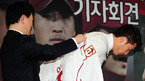 [OSEN=목동구장, 민경훈 기자] 29일 오전 서울 목동구장에서 열린 넥센 히어로즈의 이택근 환영식 및 기자회견에서 이택근이 양볼을 만지고 있다. 이장석 넥센 대표이사는 이날 환영식에서 기존에 이택근이 사용하던 29번이 새겨