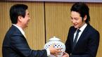 [OSEN = 백승철 기자] 장근석이 19일 오후 서울 왕십리 한양대학교 총장실에서 열린 학교 발전 기금 전달식에 참석해 임덕호 총장으로 부터 선물을 받고 있다. 06학번으로 한양대 연극영화학과 4학년에 재학 중인 장근석은 이날