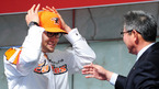 [OSEN = 백승철 기자] 박찬호(38)가 20일 오전 서울 소공로 플라자호텔에서 열린 한화 입단식에서 모자를 한대화 감독으로부터 받고 있다. 한화 구단과 박찬호는 19일 첫 공식 만남을 통해 입단에 합의했다. 이로써 지난 1994년 한국