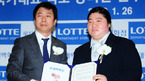 [OSEN = 백승철 기자] 26일 오후 서울 소공동 롯데호텔에서 열린 '롯데백화점 장미란 선수 및 재단 후원 협약식'에서 롯데백화점 마케팅부문장 이갑 상무와 장미란이 협약서를 들고 기념촬영을 하고 있다. 이날 열린 후원 협약식