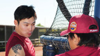 [OSEN=서프라이즈(애리조나), 민경훈 기자] 31일(한국시간) 미국 애리조나주 서프라이즈 '텍사스 레인저스 볼파크'에서 진행된 넥센 스프링캠프에서 박흥식 타격코치가 박병호의 문신을 살펴보고 있다. 지난 15일 미국 애리조나주
