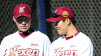 [OSEN=서프라이즈(애리조나), 민경훈 기자] 31일(한국시간) 미국 애리조나주 서프라이즈 '텍사스 레인저스 볼파크'에서 진행된 넥센 스프링캠프에서 이태양이 김병현에게 그립에 대해 물어보고 있다. 지난 15일 미국 애리조나주