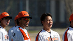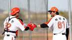 한화 이글스 선수단이 1일(한국시간) 애리조나 투산 키노 스포츠 콤플렉스에서 스프링캠프 훈련을 가졌다. 박찬호와 송신영이 다른 선수들의 훈련 모습을 지켜보고 있다. 한화 이글스 제공.