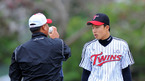 [OSEN=이시카와(오키나와), 이대선 기자] 8일 일본 오키나와현 우루마시 이시키와 구장에서 진행된 LG 스프링캠프에서 임찬규가 강상수 코치에게 지도를 받고 있다. 전 선수가 호흡을 맞추는 이번 LG의 스프링캠프는 주전 확보를