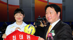 [OSEN=민경훈 기자] 10일 오후 서울 올림픽공원 SK핸드볼경기장 보조경기장에서 열린 SK루브리컨츠 핸드볼팀 창단식에서 최태원 대한핸드볼협회장(SK 그룹 회장)이 김정심 주장에게 유니폼을 받고 함께 있던 김정심 선수의 딸을