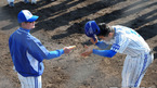 [OSEN=온나(오키나와), 이대선 기자] 10일 일본 오키나와 온나 아카마구장에서 진행된 삼성 스프링캠프에서 가진 자체평가전, 4회초 첫 득점에 성공한 진갑용이 덕아웃에서 채상병과 하이파이브를 하고 있다. 괌에서 실시한 1차