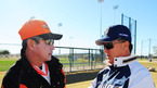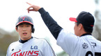 [OSEN=차탄(오키나와), 이대선 기자] 11일 일본 오키나와 차탄 구장에서 열린 LG 트윈스와 주니치 드래건스의 경기, 5회초 1사에서 LG 나성용이 펜스에 맞는 3루타를 치고 3루에서 송구홍 코치와 이야기를 하고 있다. 전 선수가 호흡