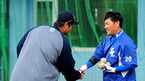 [OSEN=온나(오키나와)=지형준 기자] 21일 오후 일본 오키나와 온나 아카마구장에서 삼성 라이온즈와 오릭스 버팔로스의 연습경기가 열렸다. 오릭스 이대호가 삼성 진갑용과 인사를 나누고 있다 ./jpnews@osen.co.kr
