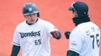 [OSEN=고양 ,백승철 기자] 8일 오후 고양시 고양국가대표 야구훈련장에서 열린 고양 원더스와 LG 2군의 평가전 경기 1말 1사 원더스 조성원이 좌전안타를 친 후 1루신경식코치와 하이파이브를 하고 있다. 김성근 감독이 초대 사령
