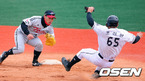 [OSEN=고양 ,백승철 기자] 8일 오후 고양시 고양국가대표 야구훈련장에서 열린 고양 원더스와 LG 2군의 평가전 경기 1회말 1사 1루 원더스 안태영 타석때 1루 주자 조성원이 2루 도루에 실패하고 있다. 김성근 감독이 초대 사령탑을