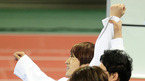 [OSEN=지형준 기자] 15일 오후 서울 잠실 학생체육관에서 열린 JTBC '신화방송' 현장공개 및 제작발표회에서 신화 전진과 이민우가 유도 경기를 마치고 포옹을 하고 있다. 올해 데뷔 14주년을 맞이한 국내 최장수 아이돌 그룹 신화