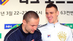 [OSEN=박준형 기자] 23일 오전 서울 여의도 63컨벤션에서 진행된 'NH농협 2011-2012 V리그' 포스트 시즌 알리는 미디어데이 행사에서 현대캐피탈 수니아스가 안젤코의 어깨 기대어 포즈를 취하고 있다. 남자부 4개 팀 감독과 주장, 외