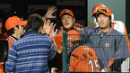 [OSEN=광주 ,백승철 기자] 3일 오후 광주구장에서 열린 '2012 팔도 프로야구' KIA 타이거즈와 SK 와이번스의 경기 8회초 1사 3루 투런포를 친 후 최정이 덕아웃에서 동료들의 축하를 받고 있다. SK는 초반 상승세가 주춤하면서 시즌 9승