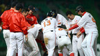 [OSEN=인천, 곽영래 기자] 13일 오후 인천 문학야구장에서 열린 '2012 팔도 프로야구' SK 와이번스와 넥센 히어로즈의 경기 11회말 1사 1,2루 SK 임훈이 끝내기 안타를 치고 선수들에 둘러 쌓여 기뻐 하고 있다. 넥센은 전날 패배를 설
