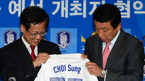 [OSEN=민경훈 기자] 14일 오후 서울 종로구 신문로 축구회관 1층에서 열린 ‘대한축구협회(KFA)-고양시 월드컵 아시아 최종 예선 개최지 협약식’에서 최강희 감독이 최성 시장에게 유니폼을 전달하고 있다. 이 자리에는 조중연