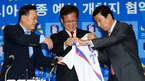 [OSEN=민경훈 기자] 14일 오후 서울 종로구 신문로 축구회관 1층에서 열린 ‘대한축구협회(KFA)-고양시 월드컵 아시아 최종 예선 개최지 협약식’에서 조중연 회장과 최성 고양시장, 최강희 국가대표팀 감독이 포토타임을 갖고 있