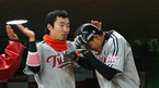 [OSEN=인천, 이대선 기자] 15일 오후 인천야구장에서 열린 '2012 팔도 프로야구' SK 와이번스와 LG 트윈스와의 경기, 9회초 무사 1루 LG 서동욱의 역전 1타점 적시 3루타 때 홈을 밟은 1루주자 김용의가 정성훈에게 축하를 받고 있다.