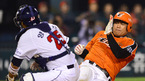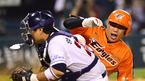 [OSEN=잠실,박준형 기자] 16일 오후 서울 잠실구장에서 열리는 2012 팔도 프로야구 두산 베어스와 한화 이글스의 경기 8회초 1사 1,2루 한화 오선진의 동점 적시타때 2루 주자 최진행이 홈에 세이프되고 있다. 두산의 선발투수 김선