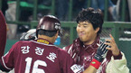 [OSEN=부산, 민경훈 기자] 16일 오후 사직구장에서 열린 '2012 팔도 프로야구' 롯데 자이언츠와 넥센 히어로즈와의 경기에서 9회초 1사 주자 1,3루 넥센 강병식의 1루수 앞 땅볼때 홈을 밟은 강정호가 덕아웃에서 동료들과 기쁨을 나