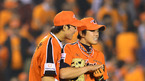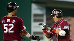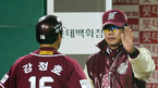 [OSEN=부산, 민경훈 기자] 16일 오후 사직구장에서 열린 '2012 팔도 프로야구' 롯데 자이언츠와 넥센 히어로즈와의 경기에서 6회초 1사 주자 1루 홈런 레이스 선두 넥센 강정호가 좌월 투런 홈런을 날린 후 덕아웃에서 김시진 감독