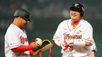 [OSEN=부산, 민경훈 기자] 16일 오후 사직구장에서 열린 '2012 팔도 프로야구' 롯데 자이언츠와 넥센 히어로즈와의 경기에서 6회초 1사 주자 1루 홈런 레이스 선두 넥센 강정호가 좌월 투런 홈런을 날린 후 3루에서 염경엽 코치와 하