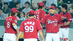 [OSEN=대구,지형준 기자] 16일 오후 대구구장에서 열린 '2012 팔도 프로야구' 삼성 라이온즈와 KIA 타이거즈의 경기, 3회말 KIA 서재응이 2사 만루의 위기를 넘긴 라미레즈를 격려하고 있다. 삼성 라이온즈의 고공 행진이 이어질까.