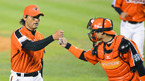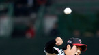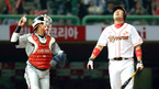 [OSEN=잠실, 이대선 기자] 17일 오후 서울 잠실야구장에서 열린 '2012 팔도 프로야구' 두산 베어스와 한화 이글스의 경기, 7회말 2사 한화 박찬호가 두산 양의지를 삼진으로 처리하고 포수 정범모와 하이파이브를 하며 더그아웃으로