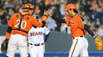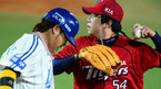 [OSEN=잠실, 이대선 기자] 17일 오후 서울 잠실야구장에서 열린 '2012 팔도 프로야구' 두산 베어스와 한화 이글스의 경기, 5회말 2사 3루 한화 박찬호가 임재철을 외야플라이로 처리하고 포수 정범모와 하이파이브를 하고 있다. 한
