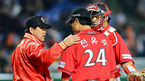 [OSEN=대전 ,백승철 기자] 18일 오후 대전 한밭야구장에서 열린 '2012 팔도 프로야구' 한화 이글스와 SK 와이번스의 경기 7회말 2사 1루 이만수 감독이 마운드에 올라가 전유수를 교체시키고 있다. 이날 선발투수로 나서는 한화 우완